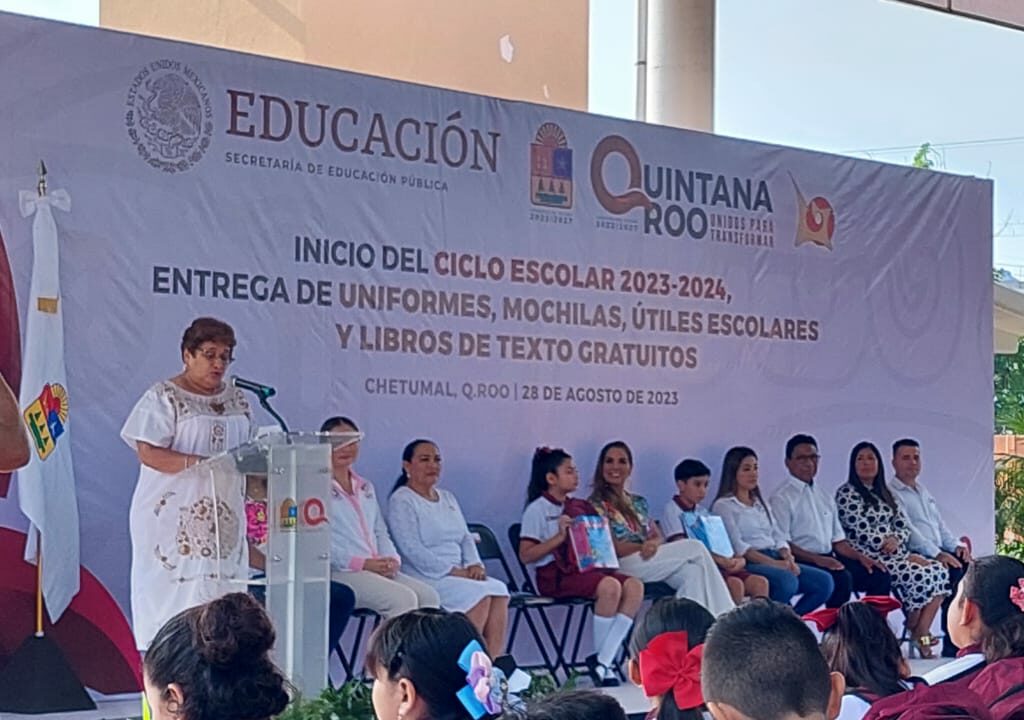 “Nuestra Nueva Escuela Mexicana es una propuesta llena de proyectos, en los cuales vamos a ir contribuyendo a mejorar nuestra aula, nuestra escuela, nuestra comunidad… y, a la vez, nos iremos haciendo mejores ciudadanos para lograr que en nuestro México se viva en paz y democracia; que ustedes sean felices; que reine la honestidad y el apoyo entre todos”, externó la subsecretaria de Educación Básica de la SEP, Martha Velda Hernández Moreno, al inaugurar el ciclo escolar 2023-2024 en Chetumal, Quintana Roo, en compañía de la gobernadora Mara Lezama.